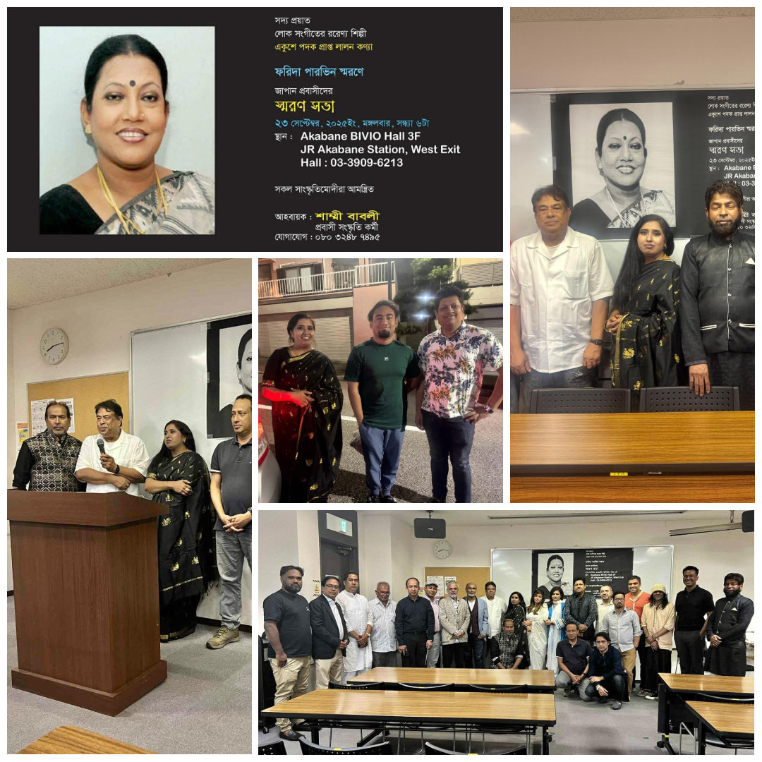 সদ্যপ্রয়াত লোকসংগীতের বরেণ্য শিল্পী ফরিদা পারভীনকে স্মরণে জাপানের টোকিওতে এক স্মরণসভা অনুষ্ঠিত হয়েছে। জাপান প্রবাসী সংগীতশিল্পী শাম্মী বাবলীর উদ্যোগে গত ২৩ সেপ্টেম্বর টোকিওর আকাবানে বিবিও হলে এ আয়োজন করা হয়।