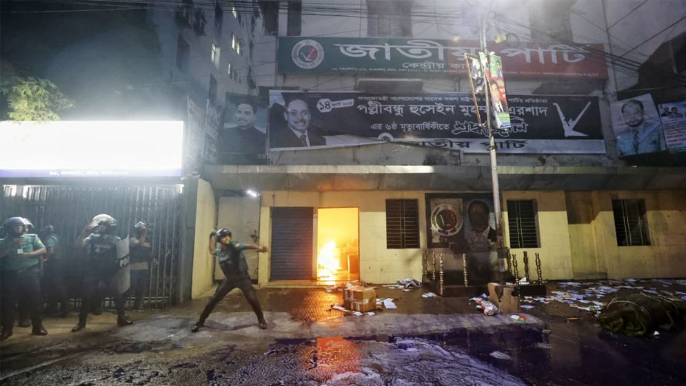 রাজধানীর কাকরাইলে জাতীয় পার্টির কেন্দ্রীয় কার্যালয়ে হামলা ও অগ্নিসংযোগের ঘটনা ঘটেছে। শনিবার (৩০ আগস্ট) সন্ধ্যা সাড়ে ৬টার দিকে এ ঘটনা ঘটে। এতে এলাকায় উত্তেজনা ছড়িয়ে পড়ে এবং বিক্ষোভকারীদের সঙ্গে পুলিশের ধাওয়া-পাল্টাধাওয়ায় সংঘর্ষ হয়।